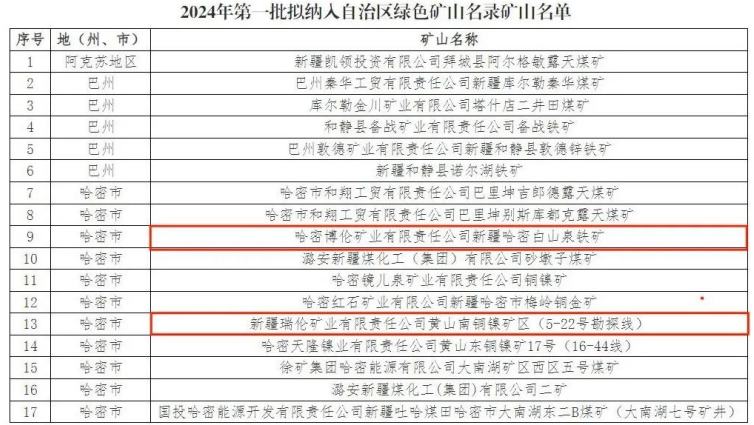 ?日前,從新疆維吾爾自治區自然資源廳傳來喜訊,公司所屬哈密博倫礦業白山泉鐵礦、新疆瑞倫礦業黃山南銅鎳礦(5-22號勘探線)順利通過公示,成功列入新疆維吾爾自治區2024年第一批綠色礦山名錄。