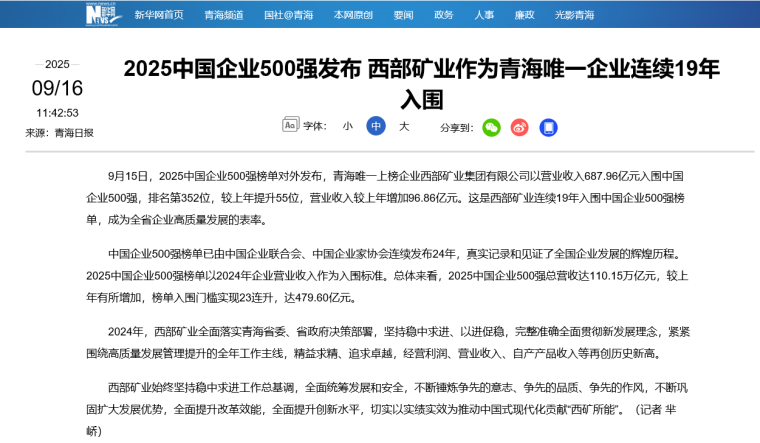 9月15日,2025中國(guó)企業(yè)500強(qiáng)榜單對(duì)外發(fā)布,青海唯一上榜企業(yè)西部礦業(yè)集團(tuán)有限公司以營(yíng)業(yè)收入687.96億元入圍中國(guó)企業(yè)500強(qiáng),排名第352位,較上年提升55位,營(yíng)業(yè)收入較上年增加96.86億元。這是西部礦業(yè)連續(xù)19年入圍中國(guó)企業(yè)500強(qiáng)榜單,成為全省企業(yè)高質(zhì)量發(fā)展的表率。