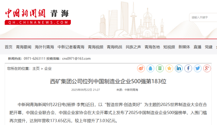 西部礦業集團以營業收入687.96億元入圍中國制造業企業500強,排名第183位,較上年提升28位。