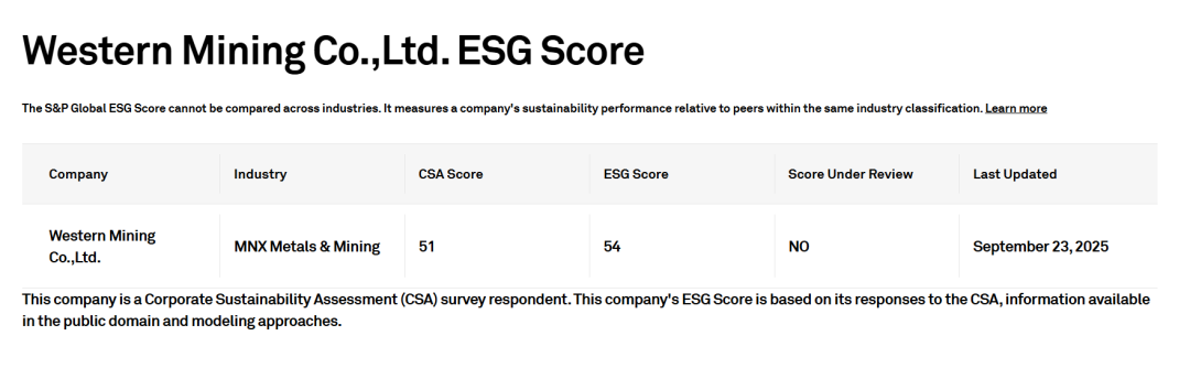 董事會事務部訊? 近日,全球最主要的評級公司標普全球更新ESG評分,西部礦業得分名列前茅,持續升高至54分(CSA Score 51,ESG Score 54),超越全球84%礦業企業。今年4月,公司還憑借在環境、社會及公司治理(ESG)方面的杰出表現成功入選《可持續發展年鑒(中國版)2025》。