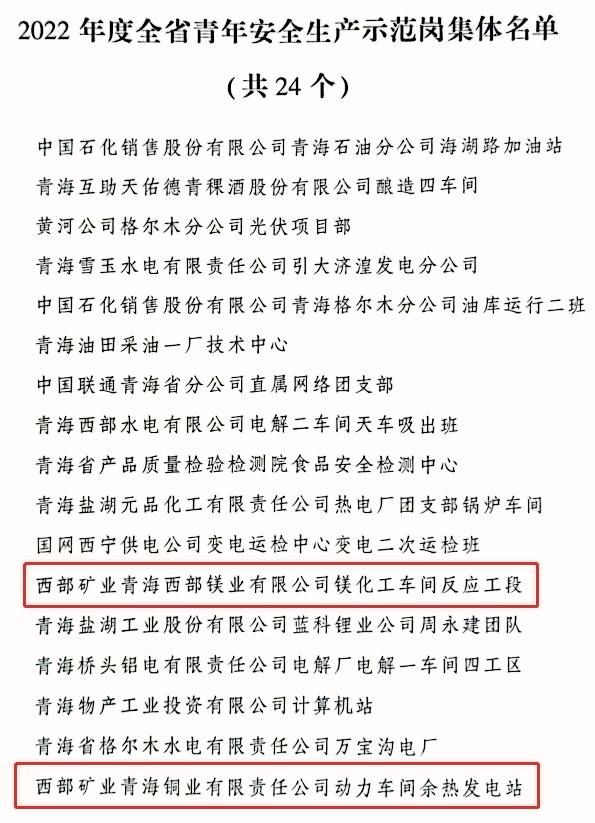 在五一國際勞動節來臨之際,公司兩個基層集體榮獲省級榮譽。西部鎂業公司鎂化工車間反應工段、青海銅業公司動力車間余熱發電站被團省委評為“2022年度青海省青年安全生產示范崗”。