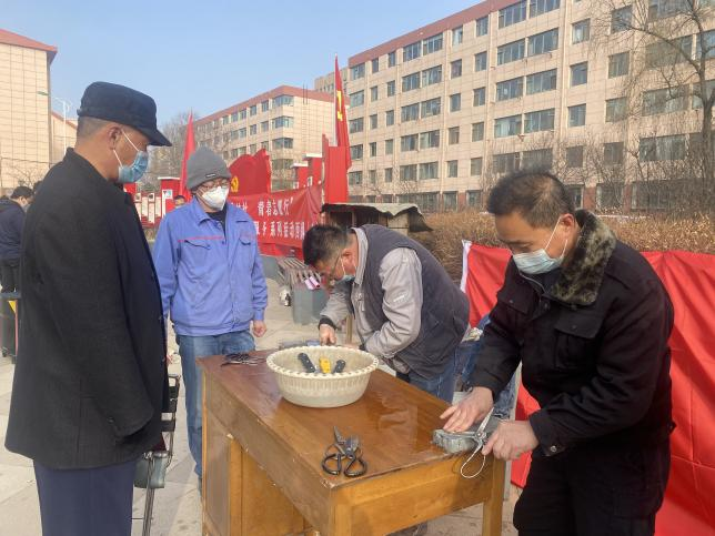 鋼城物業(yè)公司聯(lián)合西鋼集團(tuán)公司團(tuán)委、建行西川支行、市三醫(yī)院等企業(yè)在盛世華城西園三區(qū)活動(dòng)廣場(chǎng)開(kāi)展“百隊(duì)進(jìn)村社 青春志愿行”志愿服務(wù)活動(dòng),為小區(qū)住戶磨剪子、戧菜刀。