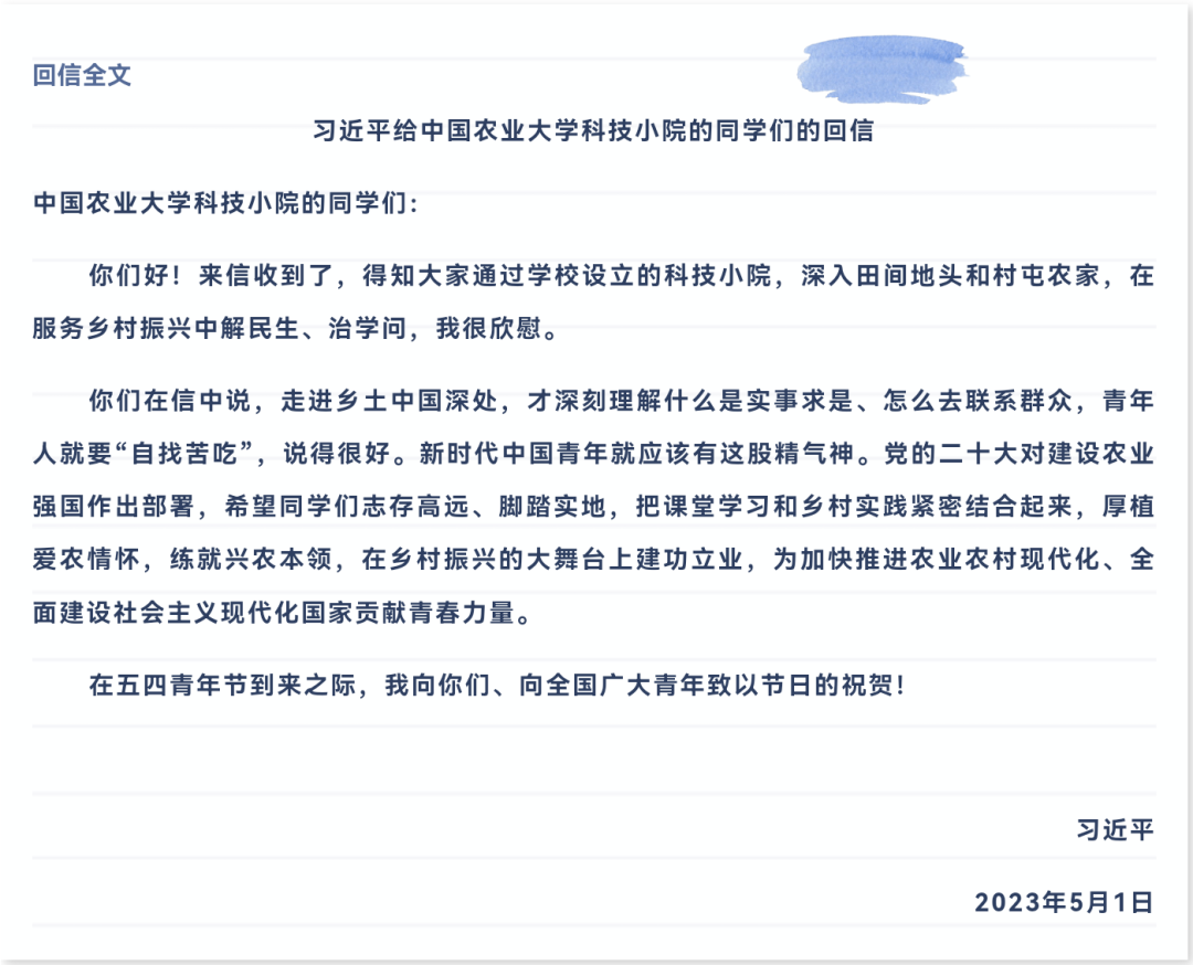 在五四青年節來臨之際,習近平總書記給中國農業大學科技小院的學生回信并向全國廣大青年致以節日祝賀,回信中字里行間無不透露著對新時代青年的殷切期望和諄諄教誨,學習習近平總書記的回信后我倍感責任重大,使命光榮。在今后,我定將牢記習近平總書記對廣大青年的囑托,以更加昂揚的斗志、充沛的干勁努力學習,充實自己,將青春之年華奉獻給公司。